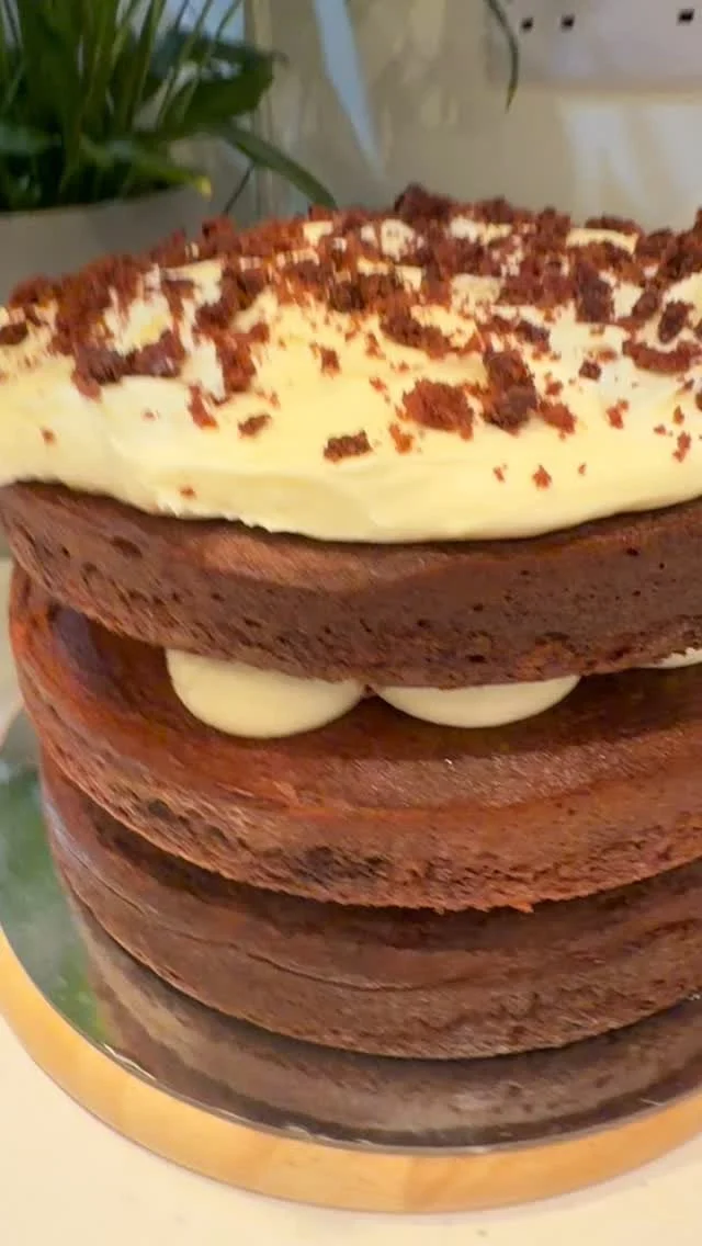 This three-layered Red Velvet marvel has been stacked with reckless optimism, slathered in cream cheese frosting, and finished with a dramatic crumb sprinkle because subtlety is overrated.