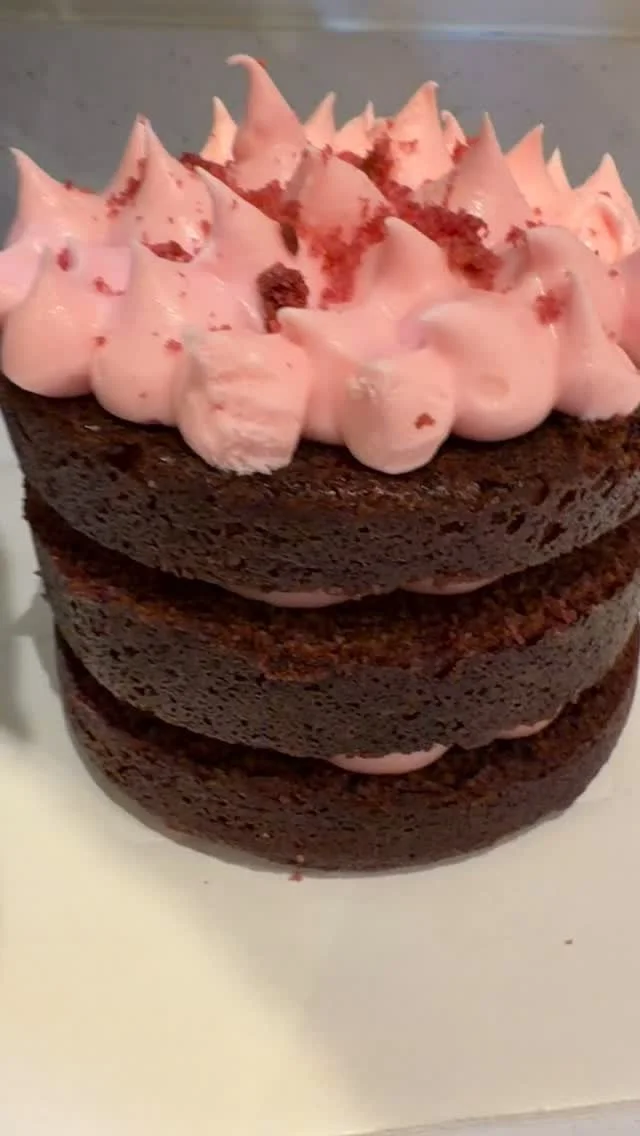 Three tiers tall. Pink cream cheese frosting piped like it’s auditioning for The Great British Bake Off: Extra. Moist? Yes. Regal? Obviously. Slightly unhinged? Absolutely.
